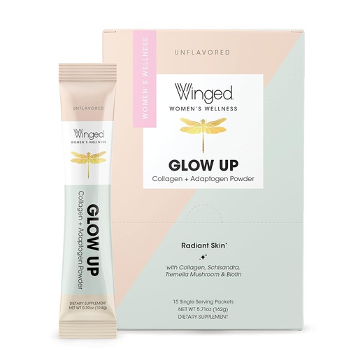 Winged Glow Up Collagen Powder | Better Hair, Skin, Nails For Women | Grass Fed Collagen Peptides W/Adaptogen Schisandra, Snow Mushroom, Vitamin C & Biotin | Unflavored, Non Gmo, 15 Count
