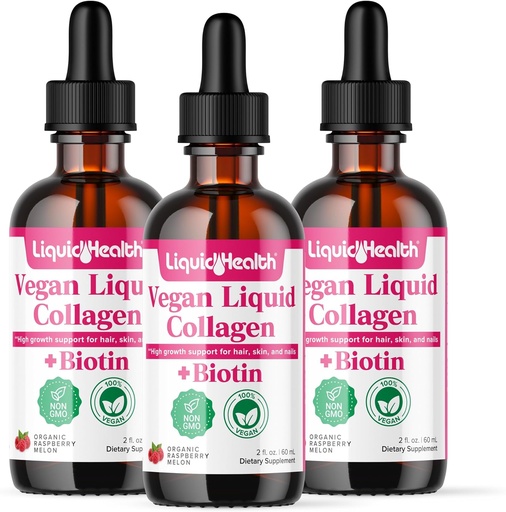 LIQUIDHEALTH 100% Vegan Collagen Plus Biotin 100,000mcg Liquid Drops - Plant-Based Liquid Collagen for Women & Men - Hair & Nail Growth, Skin Health, Boosts Metabolism - Made in USA, Non-GMO (3 Pack)