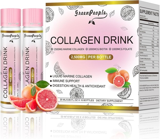 GREENPEOPLE Liquid Collagen for Women & Men, 2500mg Fish Collagen Peptides + Hyaluronic Acid + Vitamin Bs & C, Hair Skin Nails Joints Bones Support (0.85 fl oz, 10 Bottles, Grapefruit)
