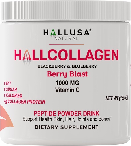 Hallusa Natural Hydrolyzed Collagen Peptides Powder 1000mg with Vitamin C | BlackBerry & Blueberry Flavor | 4g Collagen per Serving | Healthy Hair, Skin, Nails, Bone & Joint Support
