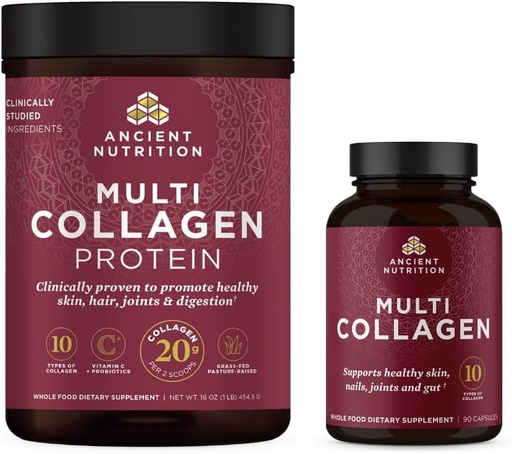 Ancient Nutrition Multi Collagen Capsules, 90 Count + Multi Collagen Protein Powder, Unflavored, 45 Servings