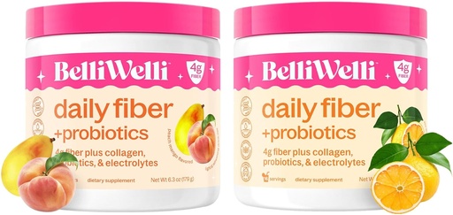 Belli Welli Daily Fiber Supplement Bundle with Collagen, Probiotics & Electrolytes – Peach Mango & Orange Yuzu Mandarin Flavors – Supports Digestion, Gut Balance & Debloating – 32 Servings Total