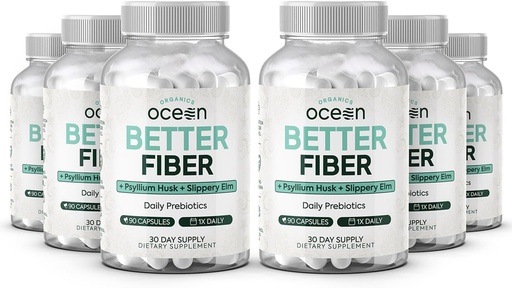Organics Ocean Better Fiber - Daily Fiber Supplement - Soften Stool for Effortless Bowel Movements - with Psyllium Hulk and Slippery Elm - 6 Bottles