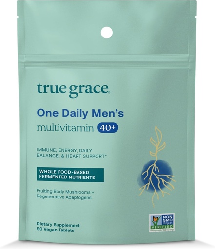 True Grace Men's 40+ One Daily Multivitamin Fermented Minerals, Organic Adaptogens & Mushrooms Whole Body Balance Immune, Endurance, Bone & Heart Support Supplement - Non-GMO - 90 Vegetarian Tablets