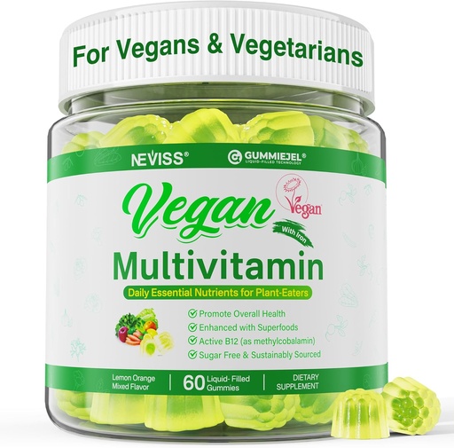 NEVISS Vegan Multivitamin for Women & Men w/Methyl B12, D3 K2, Plant Based Omega 3 (DHA+EPA), Iron, Choline, Zinc, Whole Food Daily Vitamins Gummies for Vegans & Vegetarians, Sugar Free, 60Cts