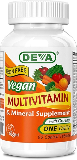 DEVA Vegan Multivitamin and Mineral Supplement - One Daily Vitamin Formula with Greens - Iron Free - 90 Coated Tablets, 1-Pack