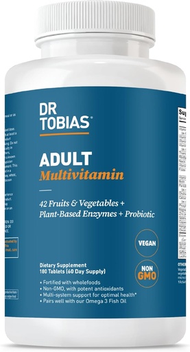 Dr. Tobias Adult Multivitamin for Women & Men, Immune Supporting Vitamins from 42 Fruits, Vegetables, Plus Probiotics, Vegan Multivitamins for Men & Women, Non-GMO, 180 Tablets, 60 Servings