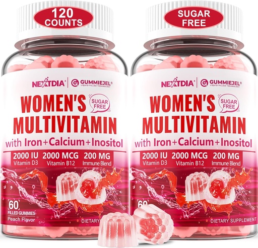 (2 Pack) Sugar Free Methylated Multivitamin for Women Gummies with Calcium, D3 K2, Inositol, Folate, Biotin, Iron, Vitamin A, C, E, B Complex - Multi Vitamins & Minerals - Energy, Immune, Bone - Vegan