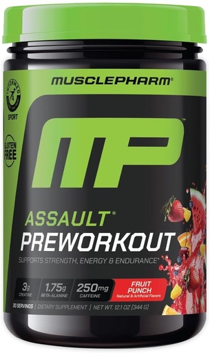 MusclePharm Assault Pre Workout Powder for Men & Women – Energy & Strength Boost Pre-Workout Supplements with Beta Alanine, Caffeine, Creatine & Betaine Anhydrous – 30 Servings, Fruit Punch Flavor