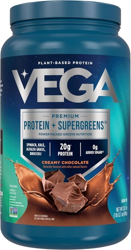 Vega Protein + Supergreens - 20g Plant-Based Protein, Chocolate, 25 Servings, Real Greens & Veggies, Vegan Keto, 0g Added Sugar, Non-GMO, Gluten Free, Dairy Free, 1.8lbs (Packaging May Vary)