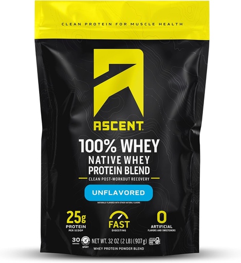 Ascent 100% Whey Protein Powder - Post Workout Whey Protein Isolate, Zero Artificial Flavors & Sweeteners, Gluten Free, 5.5g BCAA, 2.6g Leucine, Unflavored 2 lb