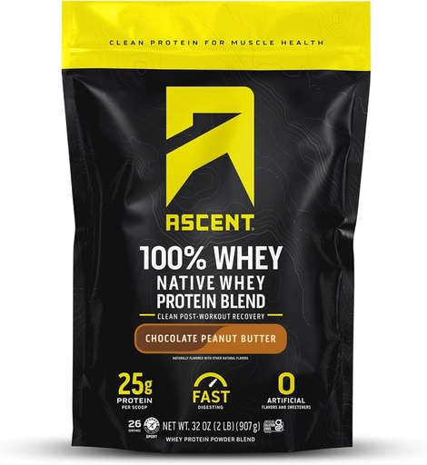 Ascent 100% Whey Protein Powder - Post Workout Whey Protein Isolate, Zero Artificial Flavors & Sweeteners, Gluten Free, 5.5g BCAA, 2.6g Leucine, Essential Amino Acids, Chocolate Peanut Butter 2 lb