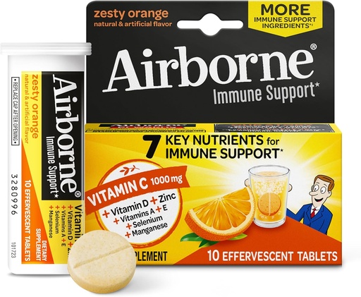 Airborne 1000mg Vitamin C with Vitamin D & Zinc, Sugar Free Multivitamin Immune Support Supplement, Antioxidants Vitamins A C & Vitamin E, 10 Effervescent Tablets, Zesty Orange Flavor