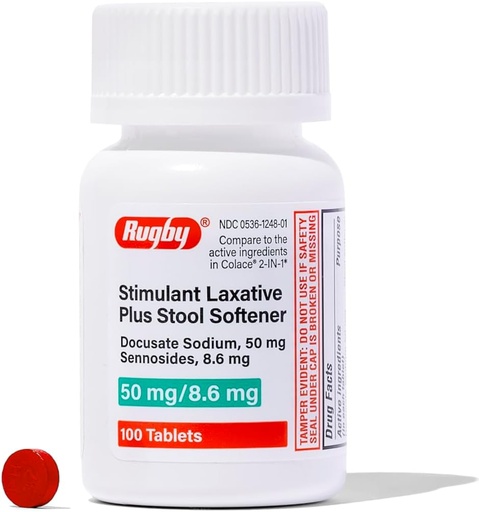 Rugby Stimulant Laxative Plus Stool Softener Docusate Sodium 50 mg/Sennosides 8.6 mg - Laxative Tablets for Constipation Relief - Stool Softeners for Women, Men, and Kids - 100 Tablets