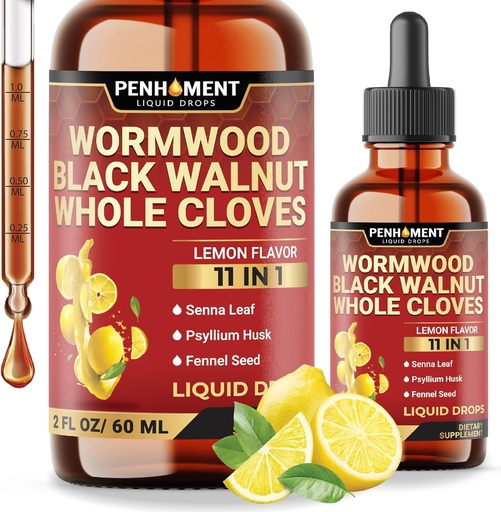 11in1 Wormwood Liquid Drops with Black Walnut Cloves, Vitamin C and D3 & 6 More - 2 FL OZ for 60 Days - Lemon Flavor