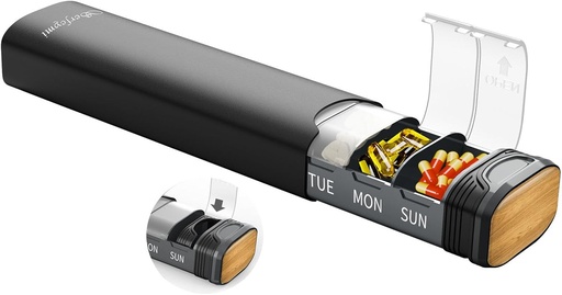 Metal Weekly Pill Organizer, Serfeymi Aluminum Daily Pill Box(Spare Gasket Provided),7 Day Pill Case Travel Medicine Organizer,Pill Containers with Individual Lid for Vitamins,Pills, Supplement-Black