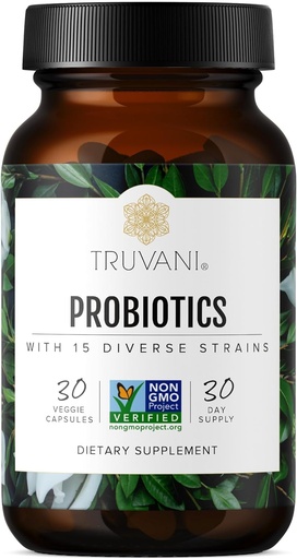 Truvani Probiotic Supplement | 30 Servings | 15 Billion CFU | 15 Diverse Strains for Digestive, Immune & Brain Health Support | Shelf-Stable Vegan Capsules | Non-GMO, No Fillers