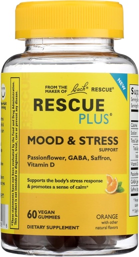 RESCUE Bach Plus Mood & Stress Support Gummies, Daytime Dietary Supplement with Passionflower, GABA, Saffron & Vitamin D, Natural Orange Flavor, Vegan & Gluten-Free, 60 Count