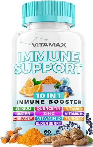 10-in-1 Immune System Support Booster with Elderberry, D3, Selenium, Quercetin, Zinc, Vitamin C, Ginger, Turmeric Curcumin, B6, Echinacea – Natural Immune Defense – Made in USA (60 Count (Pack of 1))