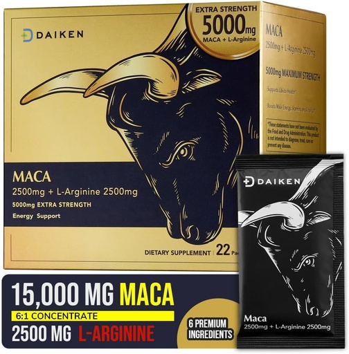 DAIKEN Peruvian Maca Root Powder Extra Strength 15,000 mg, Gelatinized Black, Red, Yellow Maca Blend with L-Arginine (2,500 mg) for Men and Women, Superior Absorption, Vegan, Lab Tested - 22 Packets