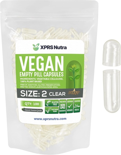 XPRS Nutra Size 2 Empty Capsules - 100 Clear Empty Vegan Capsules - Vegetarian Pill - DIY Vegetable Capsule Filling - Veggie Caps Pills for Do-It-Yourself Supplements