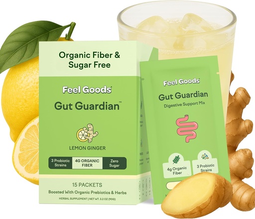 Feel Goods Gut Guardian, Organic Fiber, Probiotic & Prebiotic Powder, Sugar Free, Herbs for Bloat, Gut Health Support, Digestive Health for Men & Women, Non GMO, Vegan, Lemon Ginger, 15 Count