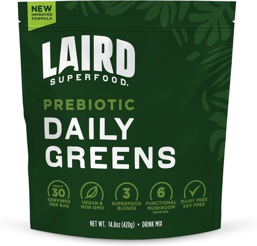 Laird Superfood Prebiotic Daily Greens Powder – Essential Vitamins & Minerals - Prebiotic Fiber, Adaptogen and Fruits & Vegetables – Supports Gut Health – Non-GMO, Vegan - 14.8 oz Bag, Pack of 1
