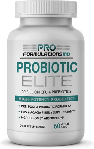 Pro Formulations MD Probiotic Elite – Synbiotic with FOS + Supernatant – 60 vcaps – Pre, Post & Probiotic Digestive Support with 20 Billion CFU, FOS, Acacia Fiber & Freeze – Dried Culture Powder