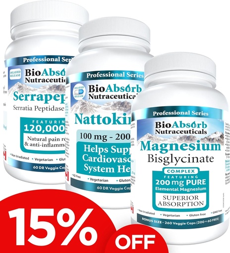 Bio Absorb Serrapeptase Enzyme 60 Caps - Nattokinase Supplement 60 Caps - Magnesium Bisglycinate 260 Caps Bundle