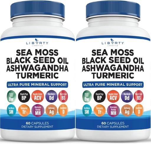 Sea Moss Black Seed Oil Ashwagandha Turmeric Bladderwrack Burdock - with Manuka, Honey Dandelion, ACV Black Pepper Gluten Free - 2-Pack