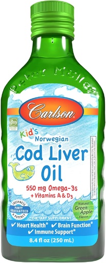 Carlson - Kid's Cod Liver Oil, 550 mg Omega-3s, Plus Vitamins A and D3, Wild Caught Norwegian Arctic Cod, Sustainably Sourced Nordic Liquid Fish Oil, Green Apple, 250 mL (8.4 Fl Oz)