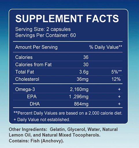 Triple Strength Omega-3 2160mg + EPA 1296mg + DHA 864mg + Natural Supplement for Healthy Heart/Brain Support, 120 Softgels, 60 Day Supply