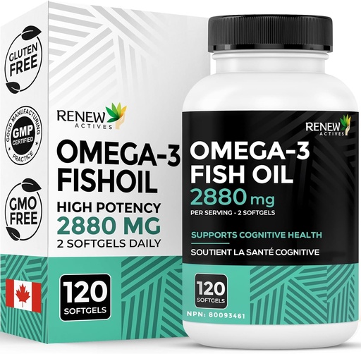 Renew Actives Omega-3 Fish Oil 2400MG per 2 Softgels - 720MG EPA & DHA - Supports Heart, Brain, Eye Health, & Triglyceride Reduction - No Fishy Aftertaste - Made in Canada - 120 Softgels