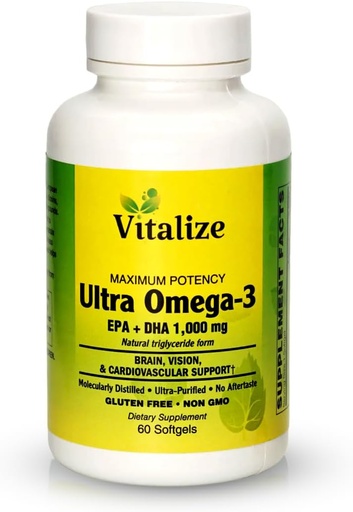 Vitalize - Ultra Omega-3 | Fish Oil | Dietary Supplement | DHA+EPA | Omega3 | Improves Cardiovascular Health | Support Blood Circulation | Support Brain Function | Gluten Free | Non GMO | 60 Softgels
