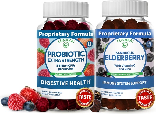 Lunakai Elderberry & Probiotic Gummies Bundle - Immune Support with Zinc and Vitamin C Plus 5 Billion CFUs Per Serving for Digestive Gut Health - Non-GMO, All Natural Gummy
