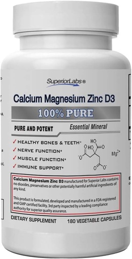 Superior Labs - Calcium Magnesium Zinc D3 - Essential Mineral Trio - 180 Vegetable Capsules - Healthy Bones & Teeth - Nerve Signaling - Muscle Function - Immune Support