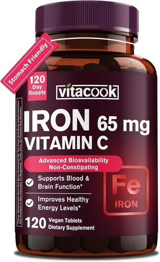 Iron Supplement for Women Men, High Potency Iron 65mg with Vitamin C 250mg, Stomach Friendly Iron Pills for Red Blood Cell & Immune Support, Non-GMO & Gluten Free,120 Vegan Tablets