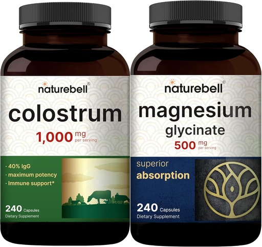 NatureBell Magnesium Glycinate Capsules 500mg & Colostrum Capsules 1,000mg Per Serving Bundle Pack | Chelated & Purified Mineral | Mother’s First Milk from Grass Fed Bovine