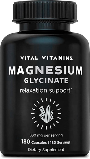 Vital Vitamins Magnesium Glycinate 500mg - High Absorption Formula - Promotes Relaxation, Calmness, & Restful Sleep - Pure Magnesium Supplement for Men & Women - 180 Capsules, Vegan, Non-GMO