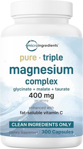 Micro Ingredients Pure Magnesium Complex, 300 Capsules | Triple Magnesium Glycinate, Malate, Taurate with Vitamin C | 100% Chelated | Supports Muscles, Nerves, & Energy | Only Active Ingredients