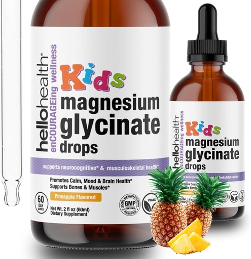 Kids Magnesium Glycinate Liquid Drops – Sugar Free Liquid Magnesium Drops, Happy Calm for Kids Calming Supplement Complex – Magnesium for Children & Nighttime Sleep, Pineapple Flavor 2 Fl Oz.