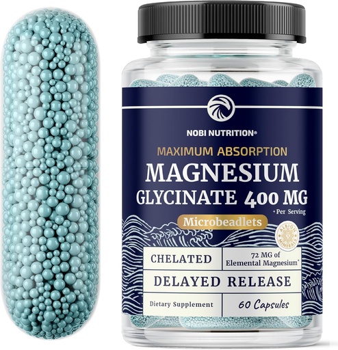 Magnesium Glycinate 400mg | High Absorption Magnesium for Sleep, Calm, Muscle Relaxation, Heart, Bone & Nerve Support for Women & Men | Advanced Microbeadlets | Chelated Mag Glycinate | 60 Ct.