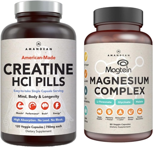 AMANDEAN Magnesium Complex & Premium Creatine HCl Bundle. Branded & Studied. USA-Made CON-CRET. High-Absorption Magnesium Threonate, Glycinate & Malate. Lean Muscle. Energy. Cognition, Memory & Sleep