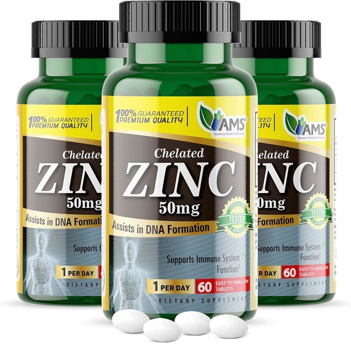 America Medic & Science Chelated Zinc 50 mg Supplements (3 Pack of 60 Tablets) Immune Booster and Powerful Antioxidant Pills for Adults Men and Women | Highly Absorbable Mineral, Improves Mood & Sleep
