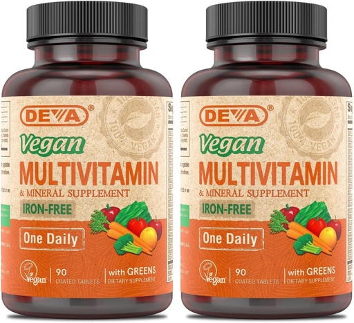 DEVA Vegan Multivitamin and Mineral Supplement - One Daily Vitamin Formula with Greens - Iron Free - 90 Coated Tablets (Pack of 2)