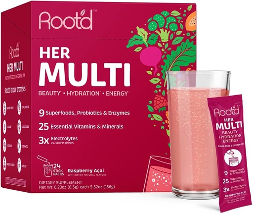 Root'd Multivitamin Powder for Women - 25 Vitamins & Minerals with 3X Electrolytes, 9 Organic Superfoods, Probiotics & Enzymes, Sugar-Free Multivitamin & Hydration | 24 Vitamin Drink Mix Packets