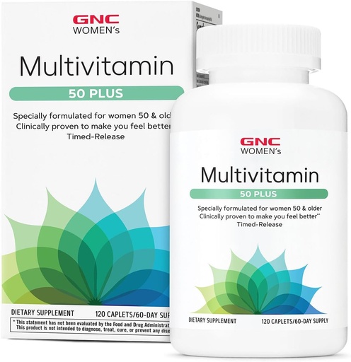 GNC Women’s 50 Plus Multivitamin Caplets, Clinically Proven to Feel Better, Vitamin D-3, Immune, Strong Bones, Memory, Mental Sharpness, Vision, Biotin, Timed Release, 120 ct, 60 svgs