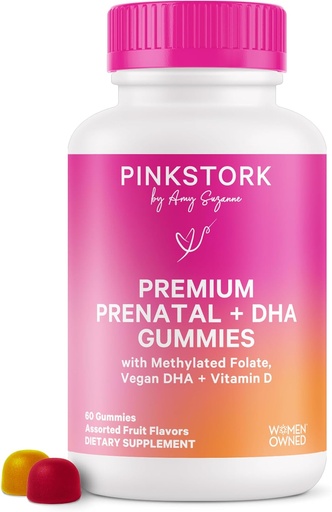 Pink Stork Premium Prenatal Gummy Vitamins with DHA, Folate, and Vitamin D - Multivitamin and Nutrient Blend for Neural Tube and Fetal Brain Development - Pregnancy Must Haves - 60 Vegan Gummies