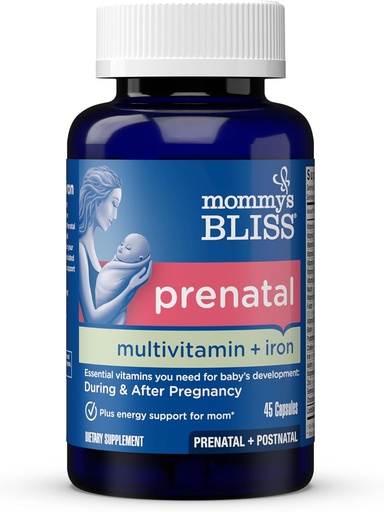 Mommy's Bliss Prenatal Multivitamin with Iron and Folic Acid, Supports Baby Development + Mom Immune System & Energy Levels w/ B Vitamins & Probiotics, Vegan & Gluten Free (45 Servings)