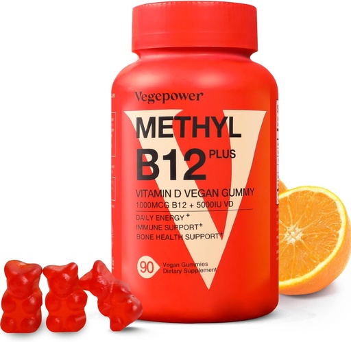 Vitamin B12 D3 Vegan Gummies - 90 Count I 1000 MCG Methyl B12 & 5000 IU Vitamin D Gummy Chewable Supplements for Adults & Kids - Immune Health & Daily Energy Boost - Non-GMO, Orange